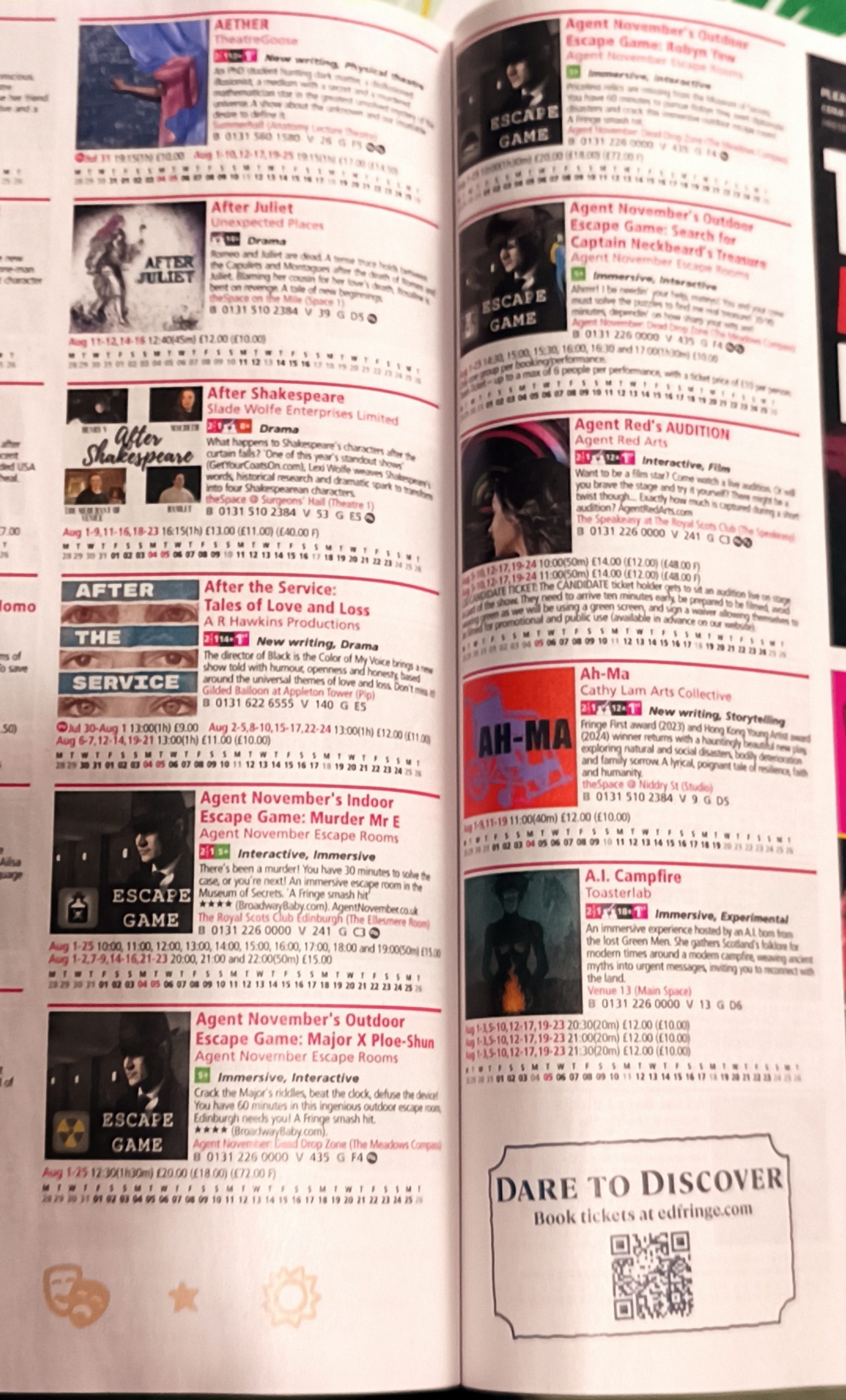 Happy to see Agent Red’s AUDITION listed on just the fourth page of the theatre section. We’ll take alphabetical privilege! It’s page 255. Also have a look at the Agent November shows immediately before it 😁
